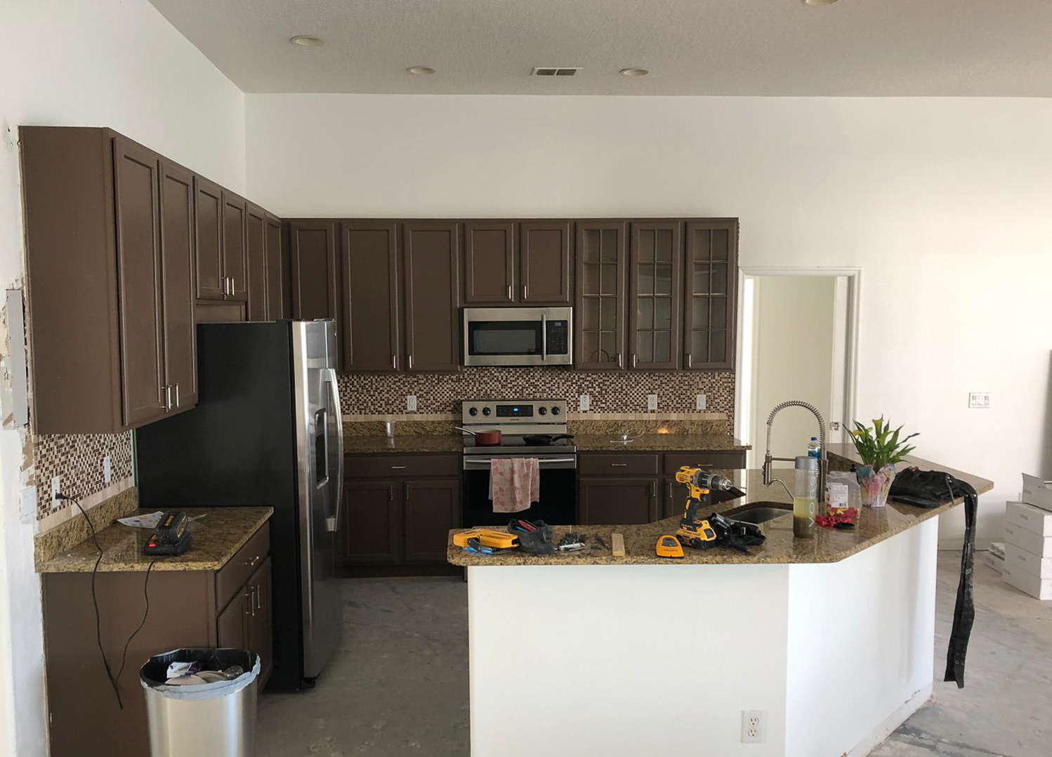 Partimos de uma cozinha escura e pouco funcional, mas com criatividade e expertise, transformamos o espaço em um ambiente luminoso e acolhedor, perfeito para os dias ensolarados da Flórida.